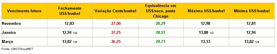 O Departamento de Agricultura dos EUA (USDA) informou que os registros de vendas de soja norte-americana destinada à exportação efetuados na semana passada totalizaram 404.400 toneladas, um bom número. Nesta data, o USDA também divulgou a venda para a China de 180.000 toneladas de soja estadunidense. Esses números foram conjuntamente muito positivos. Entretanto, os receios econômicos globais, os fatores macroeconômicos negativos, o estresse dos mercados financeiros e os desejos dos investidores de reduzir suas exposições a riscos globais terminaram por prevalecer, à sombra do temor generalizado de um desaquecimento da economia mundial. Estima-se que nesta quinta-feira os fundos de especulação tenham vendido cerca de 25.000 lotes futuros de milho, 13.000 lotes futuros (1.168.000 toneladas) de soja e 6.000 lotes futuros de trigo.