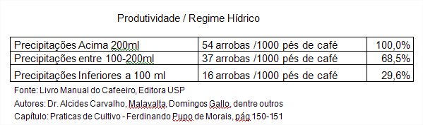 Além disso, o ano de 2010, também foi seco, com somente 98 ml de chuva no mesmo período e foi um fator determinante para a queda de produção, que não deverá chegar à 40 milhões de sacas e, as bases atuais nos dão sustentação aos números iniciais que prevíamos 35 milhões de sacas . Para efeito de segurança deveremos fechar no máximo com 38 milhões de sacas de 2011/2012. No Simpósio, do Rio de Janeiro, dias 5 e 6 de setembro passado, as principais Cooperativas apresentaram uma queda ao redor de 20% do previsto inicialmente e confirmando o afirmado de uma produção de no máximo 38 milhões de sacas para a presente safra. A quebra no rendimento, devido à seca de 2010, entre MAIO e SETEMBRO, provocou um grande susto nos cafeicultores e nas cooperativas. Precisou-se a redor de 550 a 600 litros de café para um saco beneficiado, ou seja, ao redor de 20% de prejuízo sobre a média histórica.Portanto, tivemos secas sucessivas entre, MAIO à SETEMBRO, em 2010 e 2011 e isso compromete drasticamente a produção.