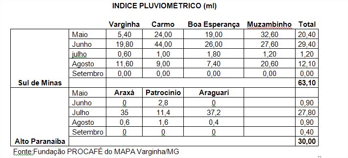 Provando essas colocações passamos abaixo dados pluviométricos em diferentes regiões produtoras de café, fornecidas pela FUNDAÇÃO PROCAFÈ do MAPA, de Varginha.