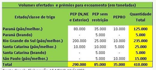 Com relação à oferta, mais uma vez é repetido o volume de 410 mil toneladas. Divididas conforme tabela abaixo: em 31,7% ao Paraná; 57,3% ao Rio Grande do Sul; 7,3% Santa Catarina e 3,6% para São Paulo. Editais disponíveis emhttp://www.afnews.com.br/conteudo.php?id=57 .Segue a preferência ao escoamento de trigo para exportação, destino que tem concentrado quase que a totalidade dos lotes arrematados nos últimos eventos.